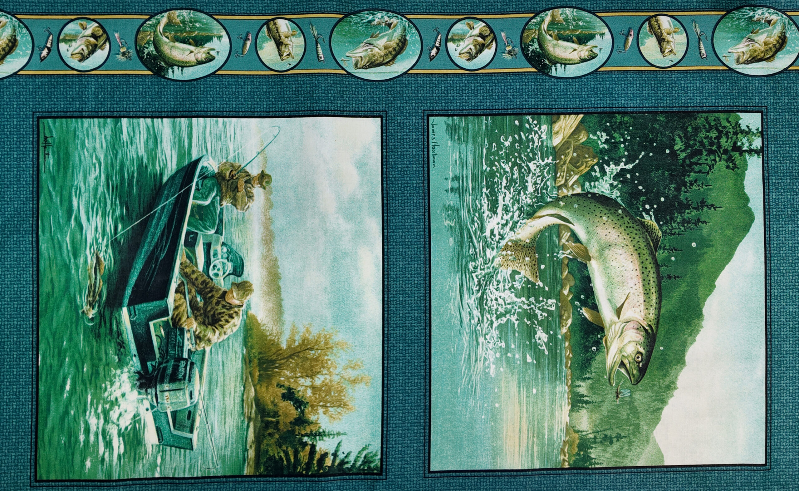 Une scène de rivière capturée dans des teintes fraîches, avec un pêcheur concentré et un poisson jaillissant hors de l’eau. Les contrastes de verts et de bleus évoquent les paysages paisibles des lacs et forêts.