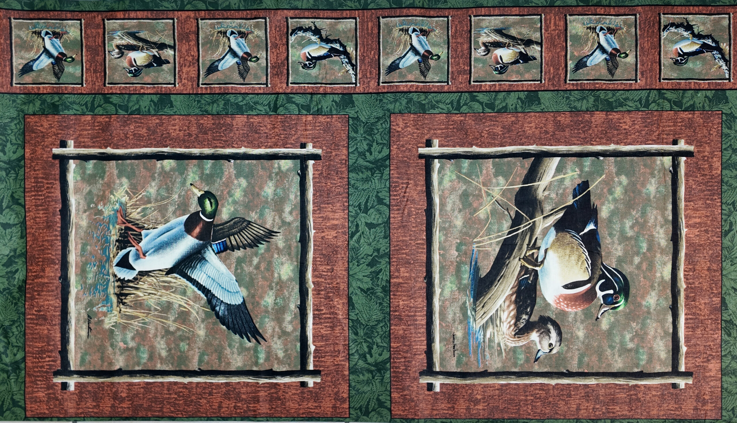 Dans une palette de verts profonds et de bruns chauds, les canards prennent leur envol ou se posent près des roseaux. Les cadres évoquent un sous-bois vivant, animé par des touches de lumière diffuse.