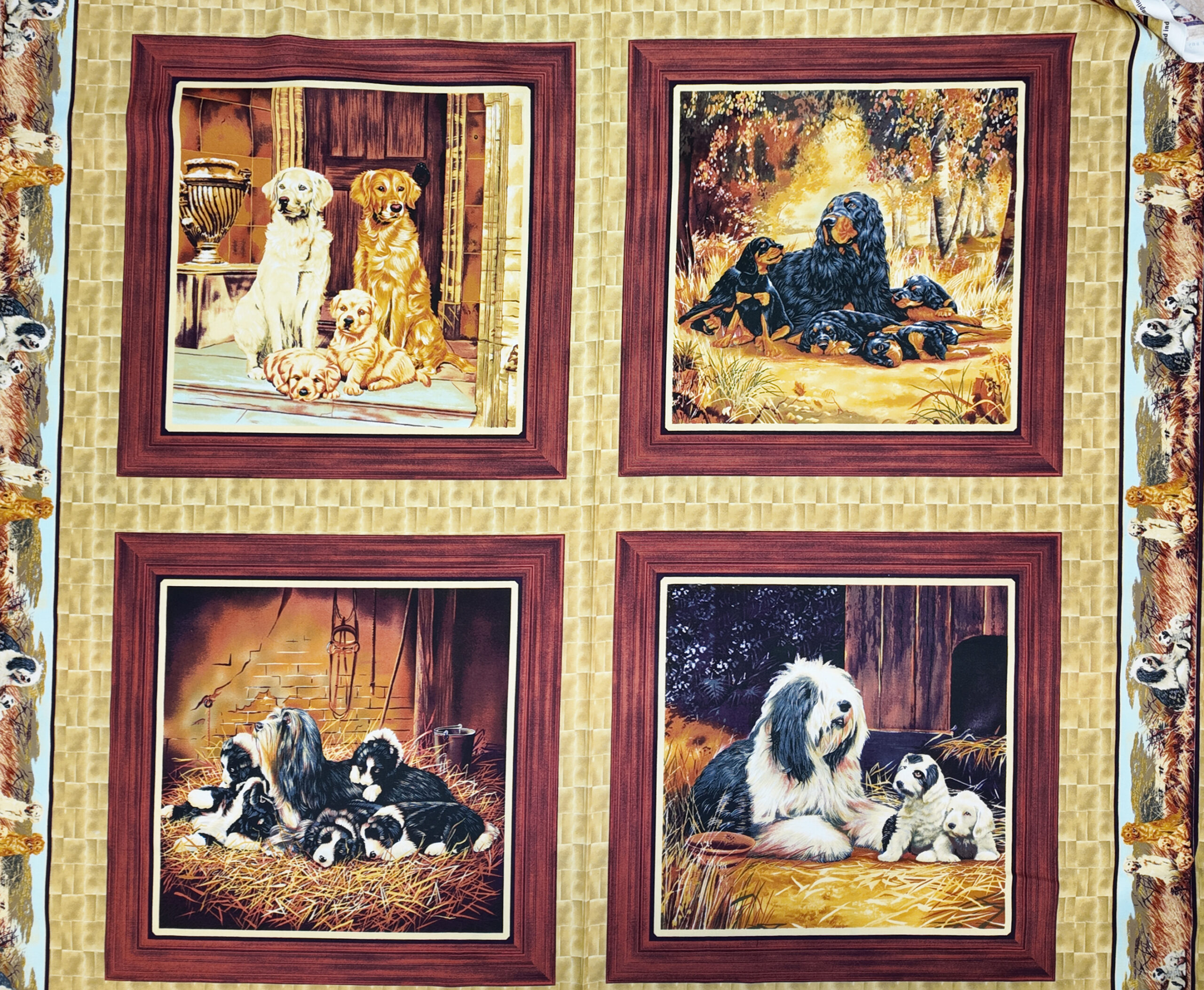 quatre scènes chaleureuses montrent des chiens reposant dans une grange baignée de lumière dorée