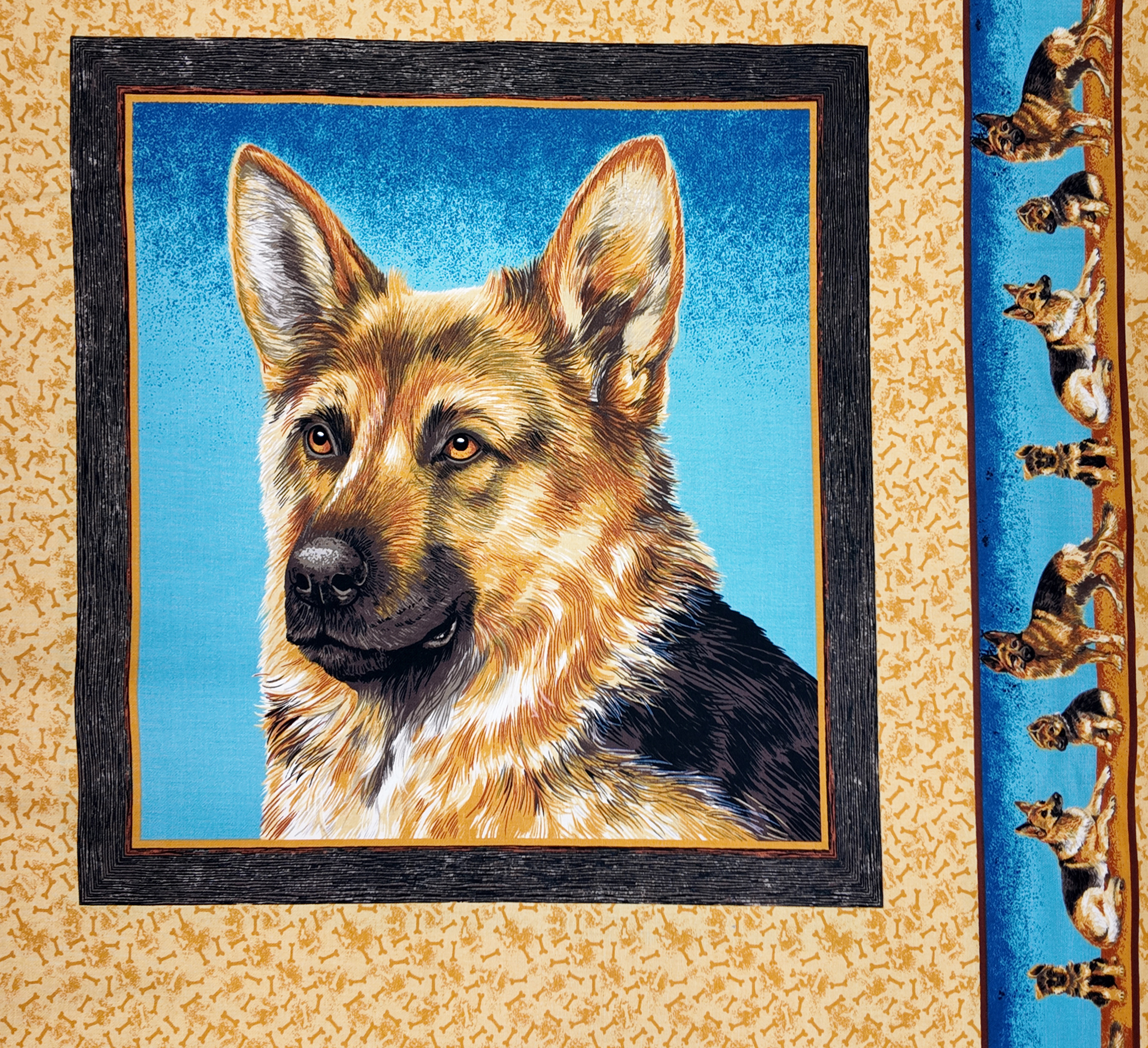 Un portrait de berger allemand, baigné d’un bleu lumineux, révèle toute la noblesse du regard. Le fond doré se mêle aux ombres chaudes du pelage