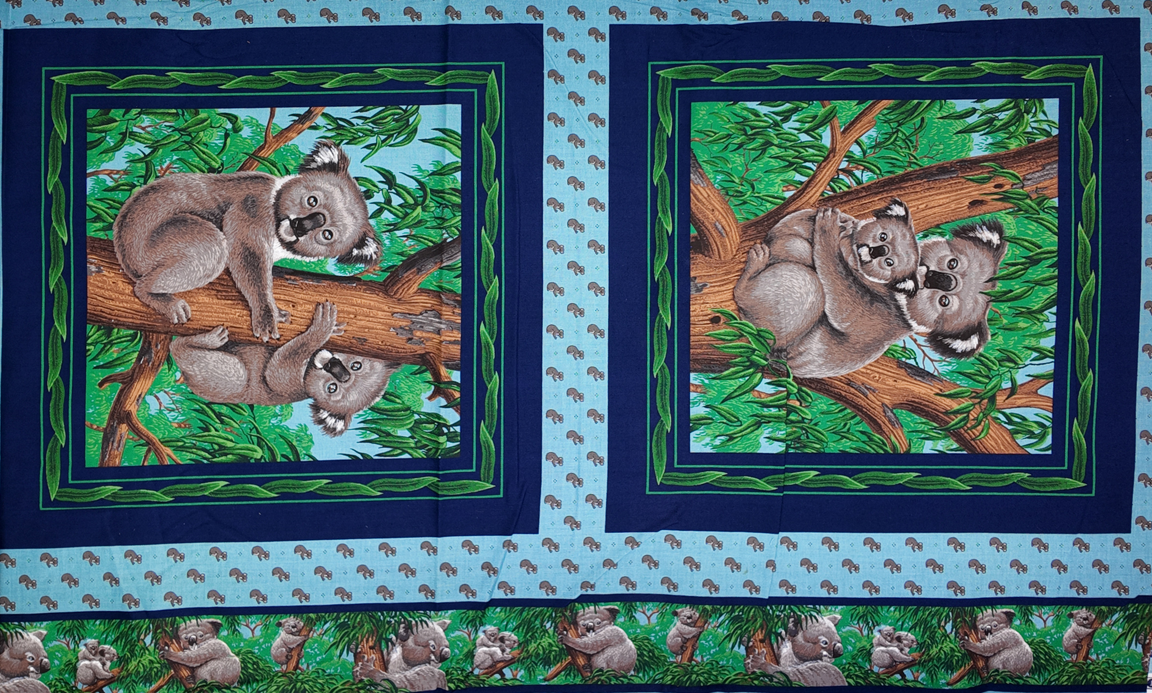 Deux koalas paisibles se lovent sur les branches d’un eucalyptus vibrant. Les verts lumineux se mêlent aux bleus francs pour créer une ambiance tendre et apaisante,