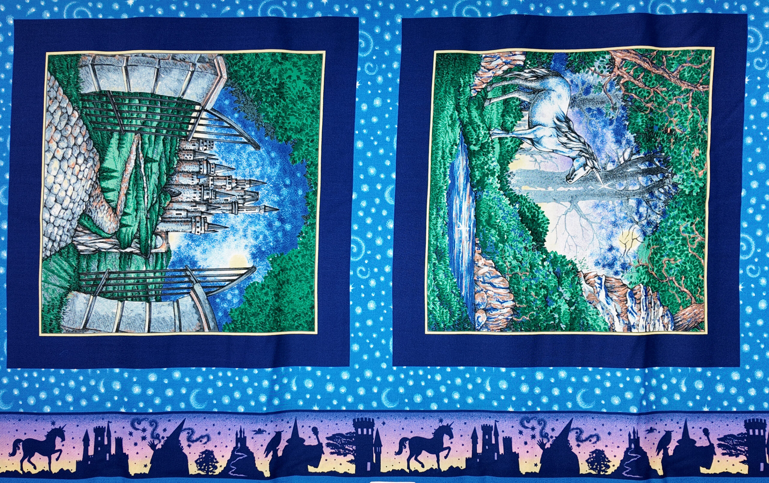 Un univers féerique prend forme entre château lointain, ciel étoilé et licorne blanche. Les nuances de bleu profond et de violet se répondent pour évoquer un monde magique où l’imaginaire s’épanouit sous une voûte scintillante.