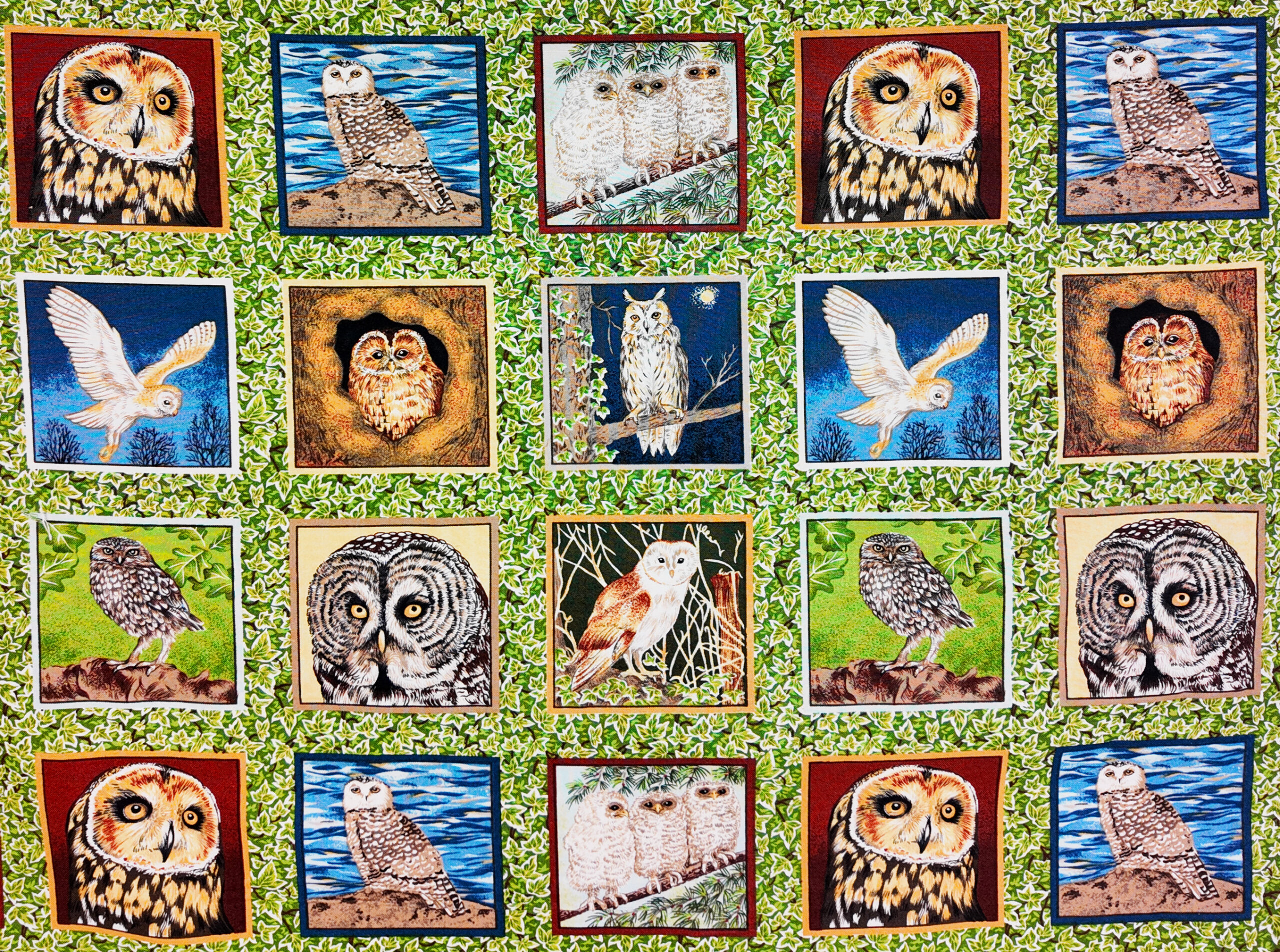 Une série de portraits de chouettes et hiboux se déploie dans un jeu de cadres colorés, posés sur un fond végétal vert, créant une galerie naturaliste riche et expressive.