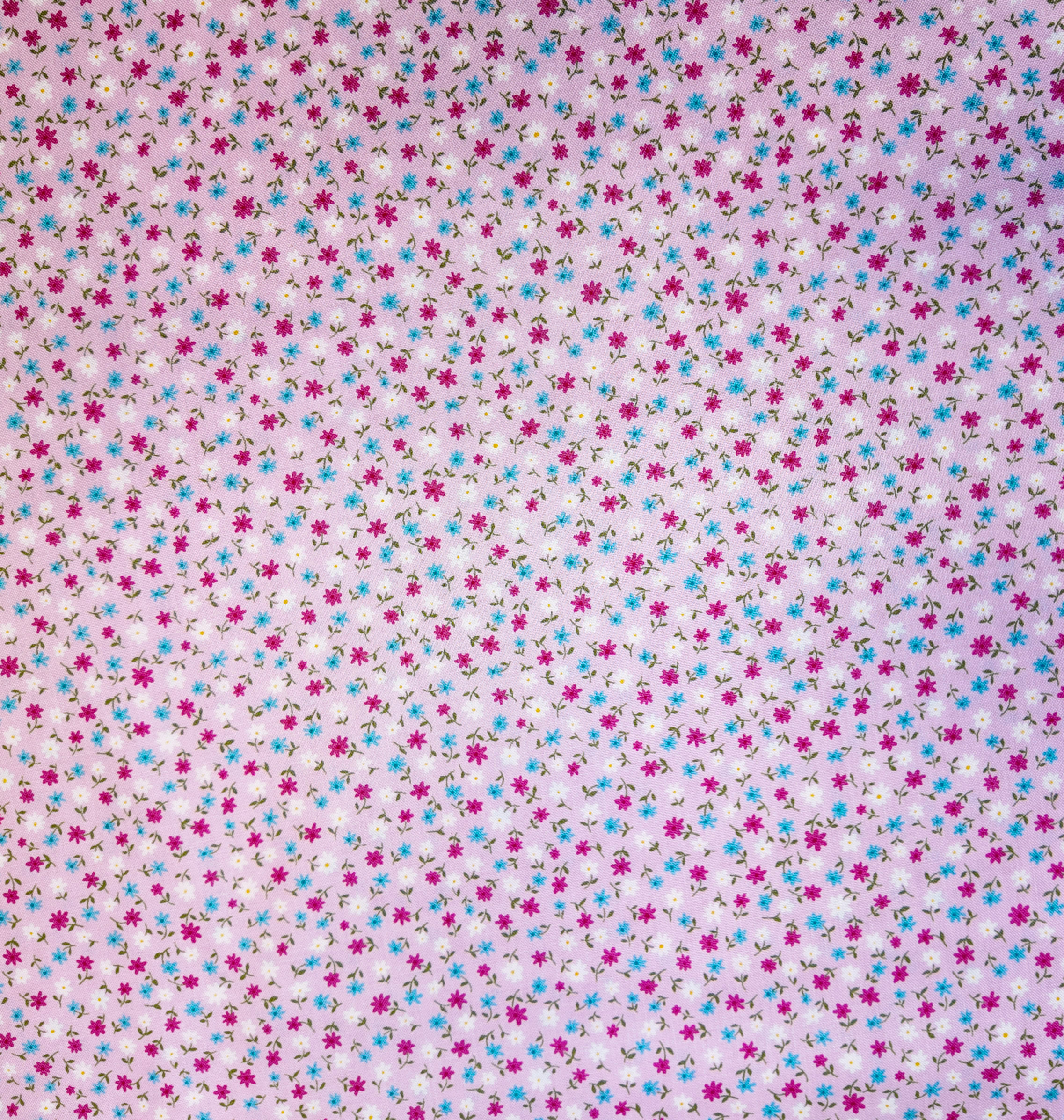 petites fleurs éclatantes en rose et turquoise sur fond lilas pâle, une note fraîche et vive comme un matin d’été.
