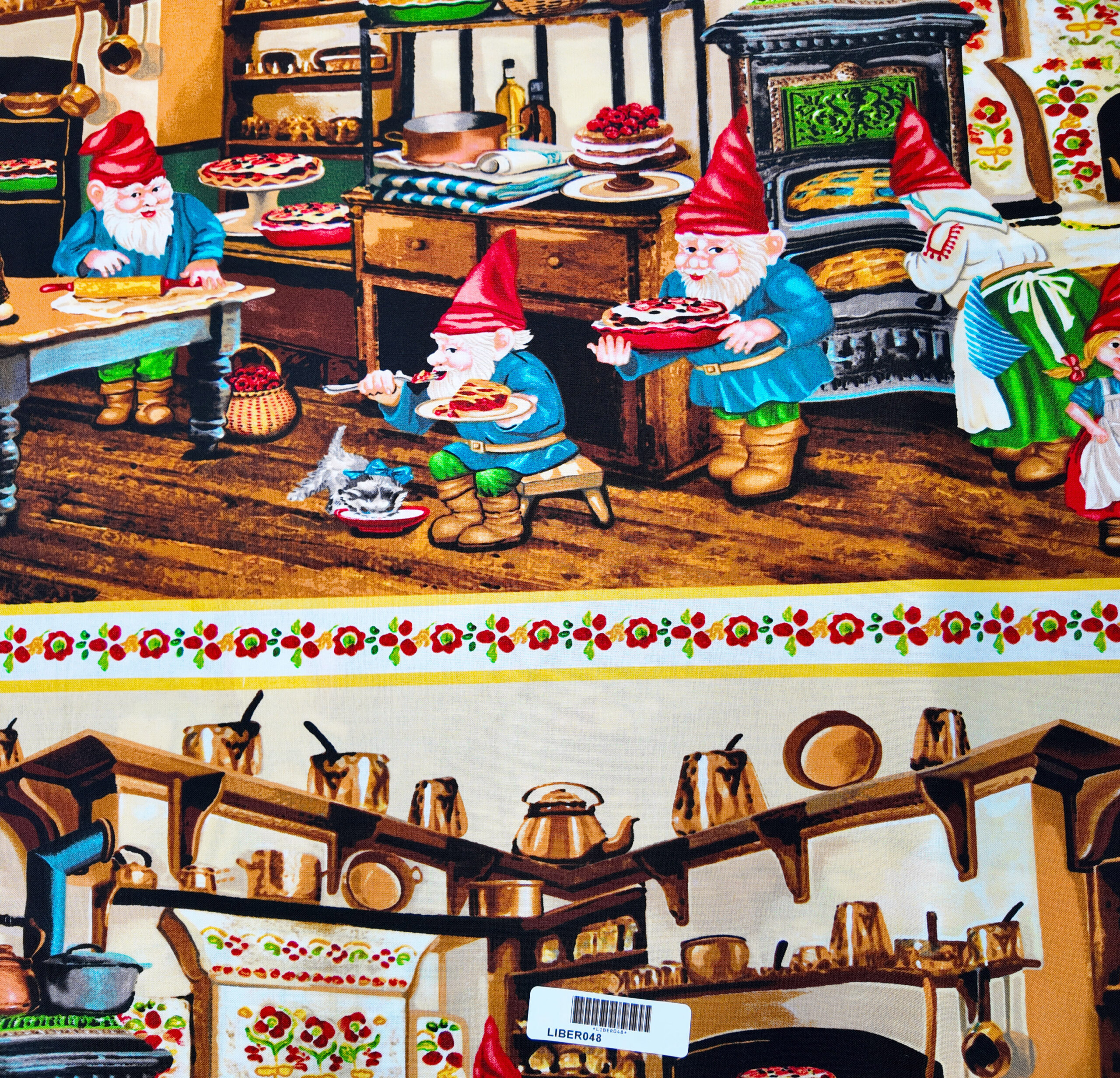 lutins en cuisine préparant des tartes, un tissu plein d’humour et de chaleur aux accents de conte ancien.