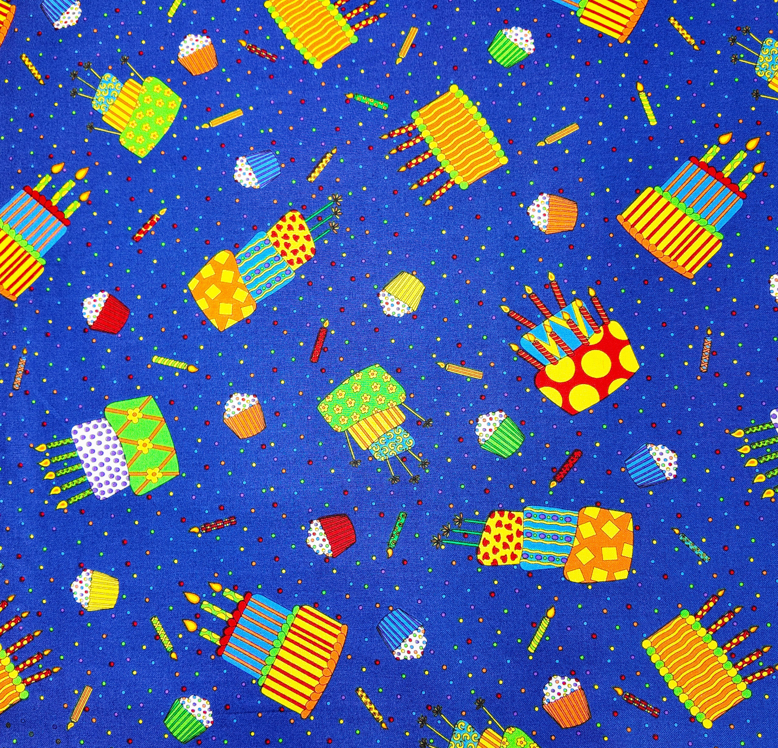 gâteaux et cupcakes multicolores sur fond bleu, un motif gourmand et pétillant comme un anniversaire.