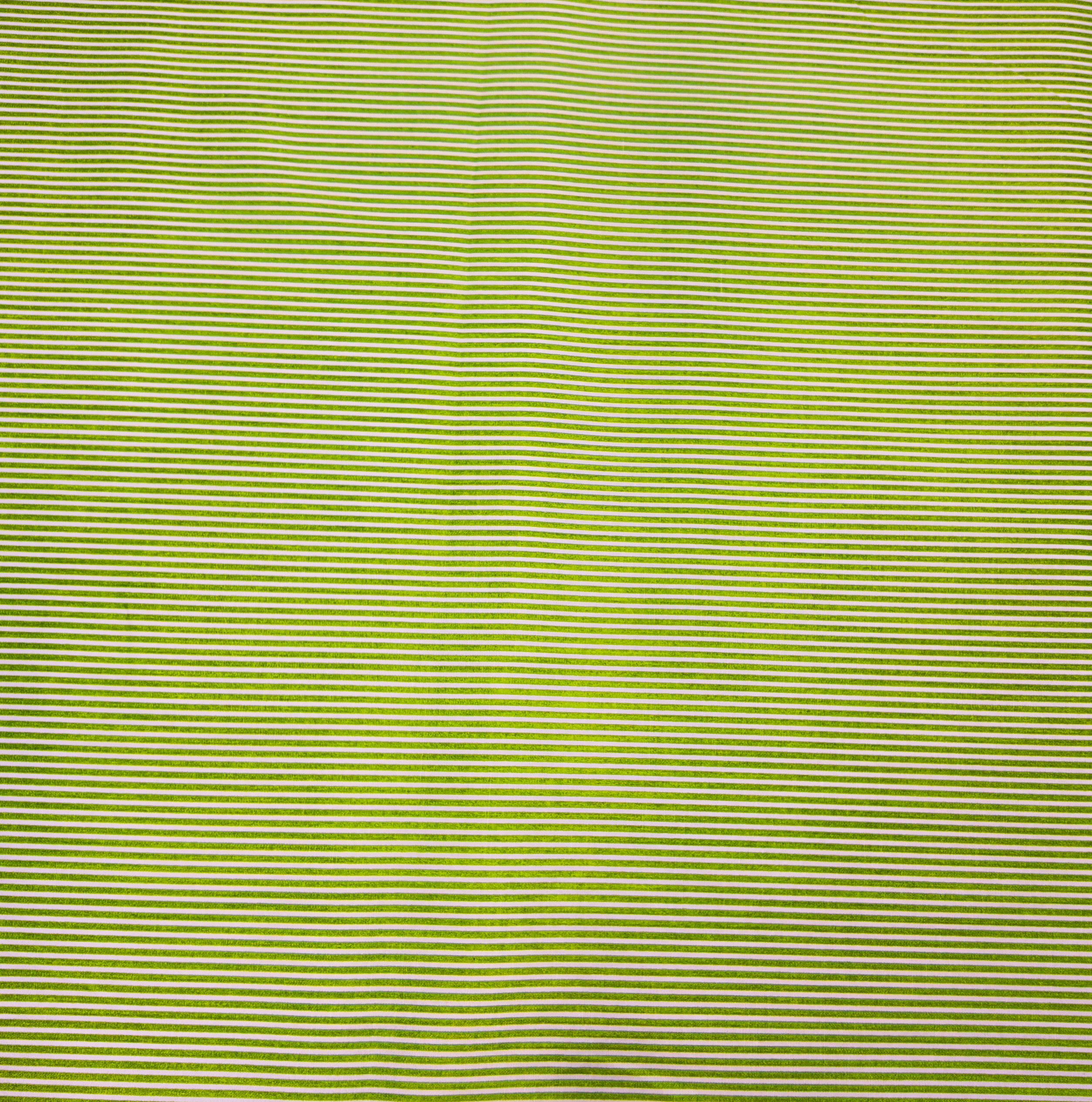 Tissu rayé vert anis et blanc, pétillant et franc, plein de vitalité et de lumière. Il appelle les journées printanières et la fraîcheur du feuillage nouveau.