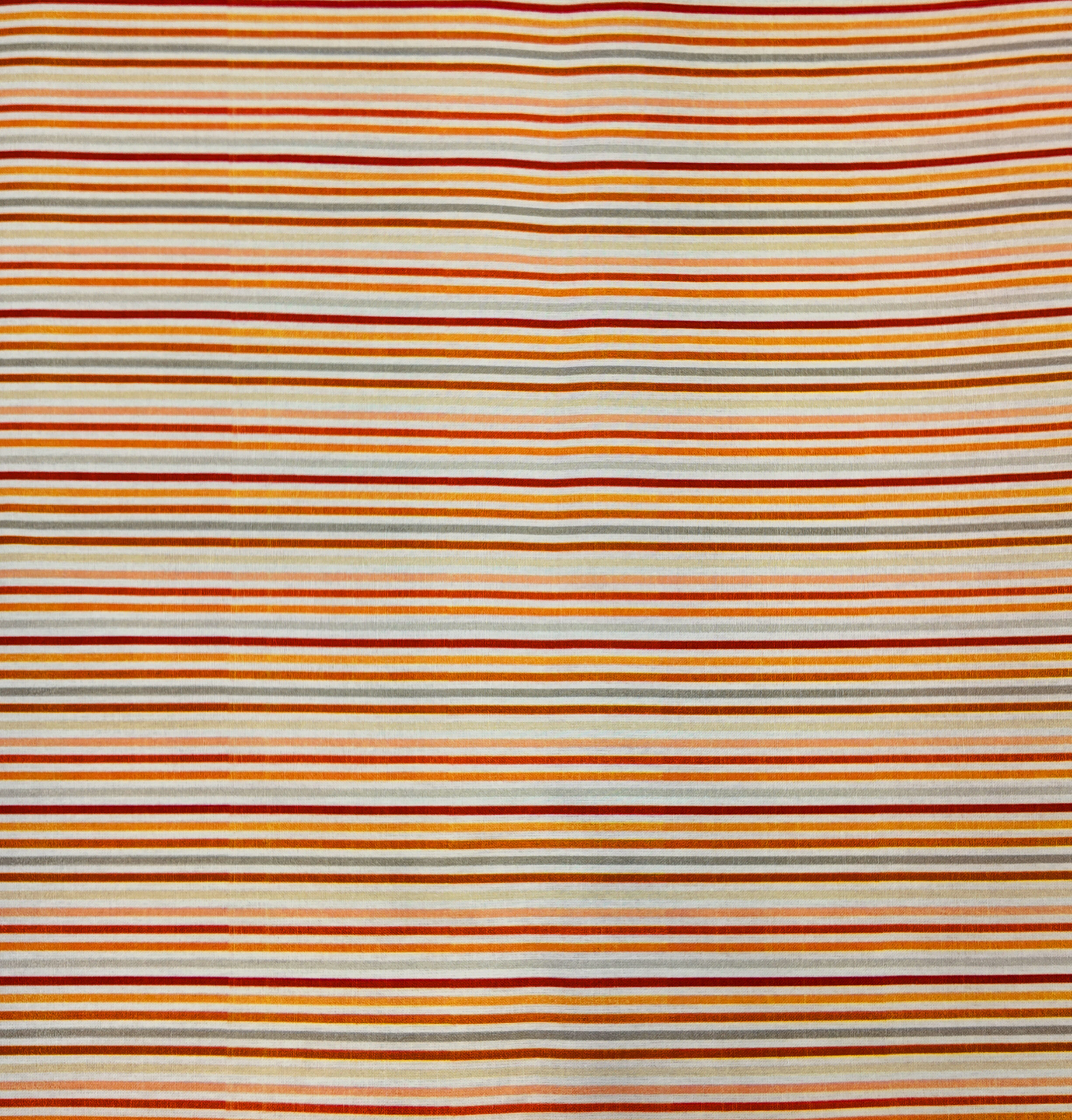 Tissu rayé aux tons chauds d’orange, safran, ocre et gris clair, comme une palette de coucher de soleil. Il inspire chaleur, douceur et élégance décontractée.