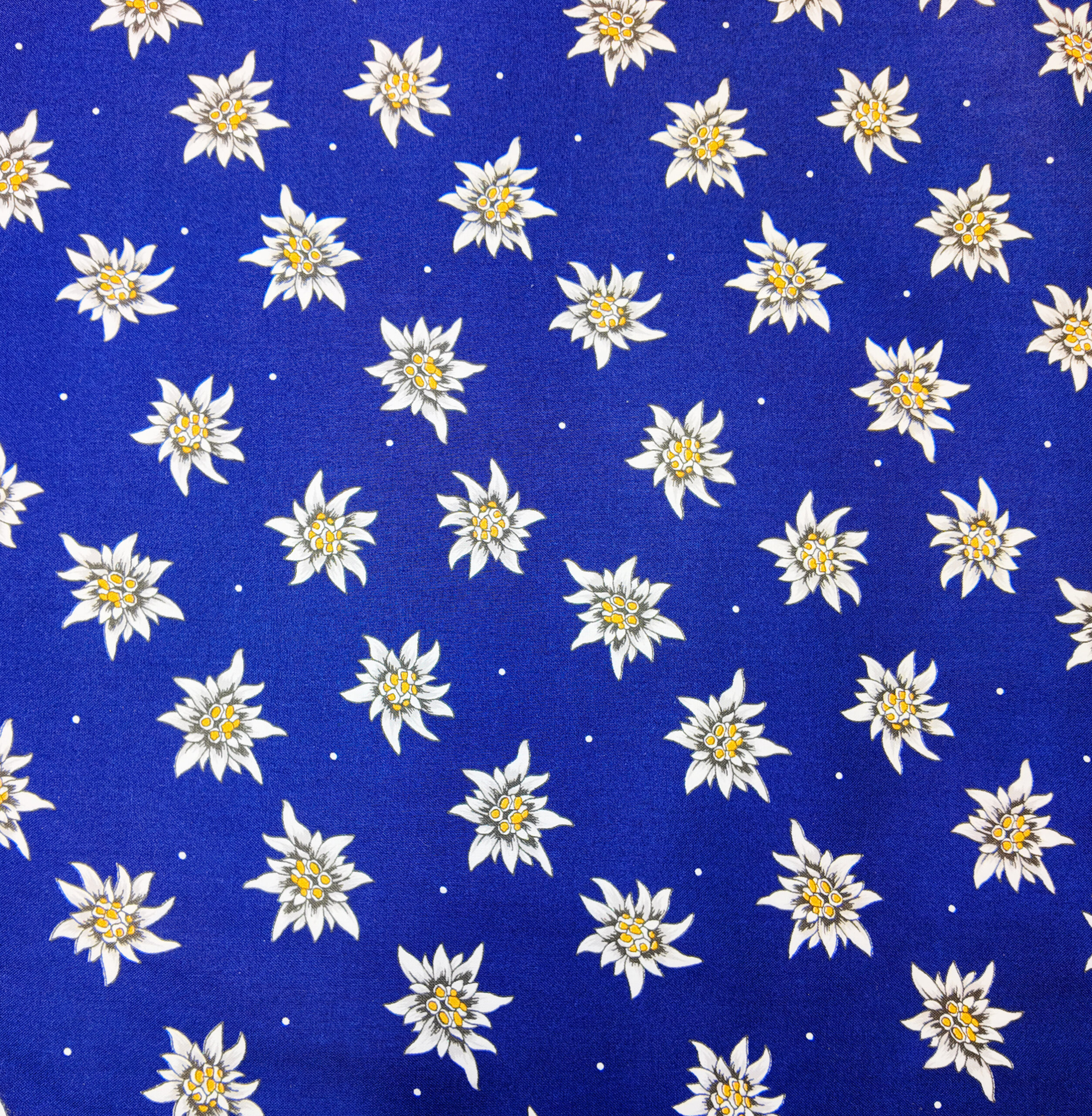 Fond bleu intense décoré de grandes edelweiss ivoire, ponctuées de petites touches dorées, symbole alpin par excellence.