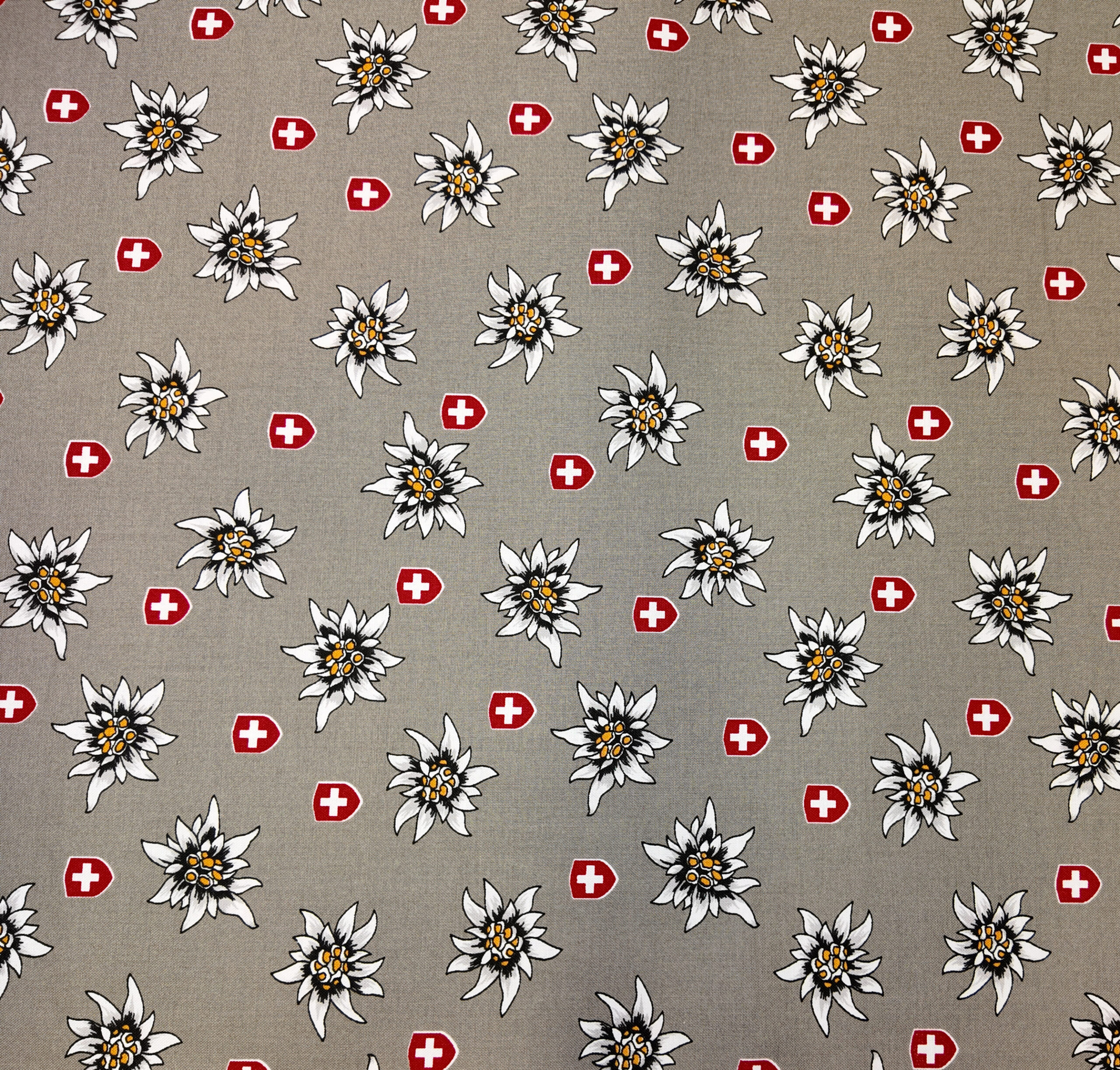 Tissu gris clair orné d’edelweiss et d’écussons rouges à croix blanche, un hommage élégant à la Suisse et à ses montagnes.