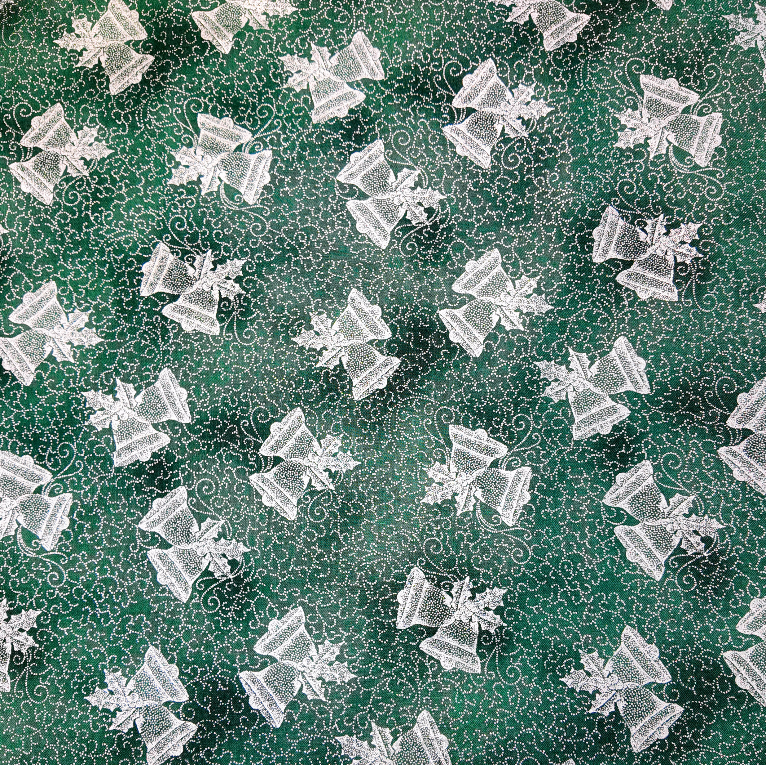 Fond vert sapin parsemé de clochettes argentées et de volutes fines. Un tissu lumineux et joyeux, où résonne l’esprit musical et festif de Noël.