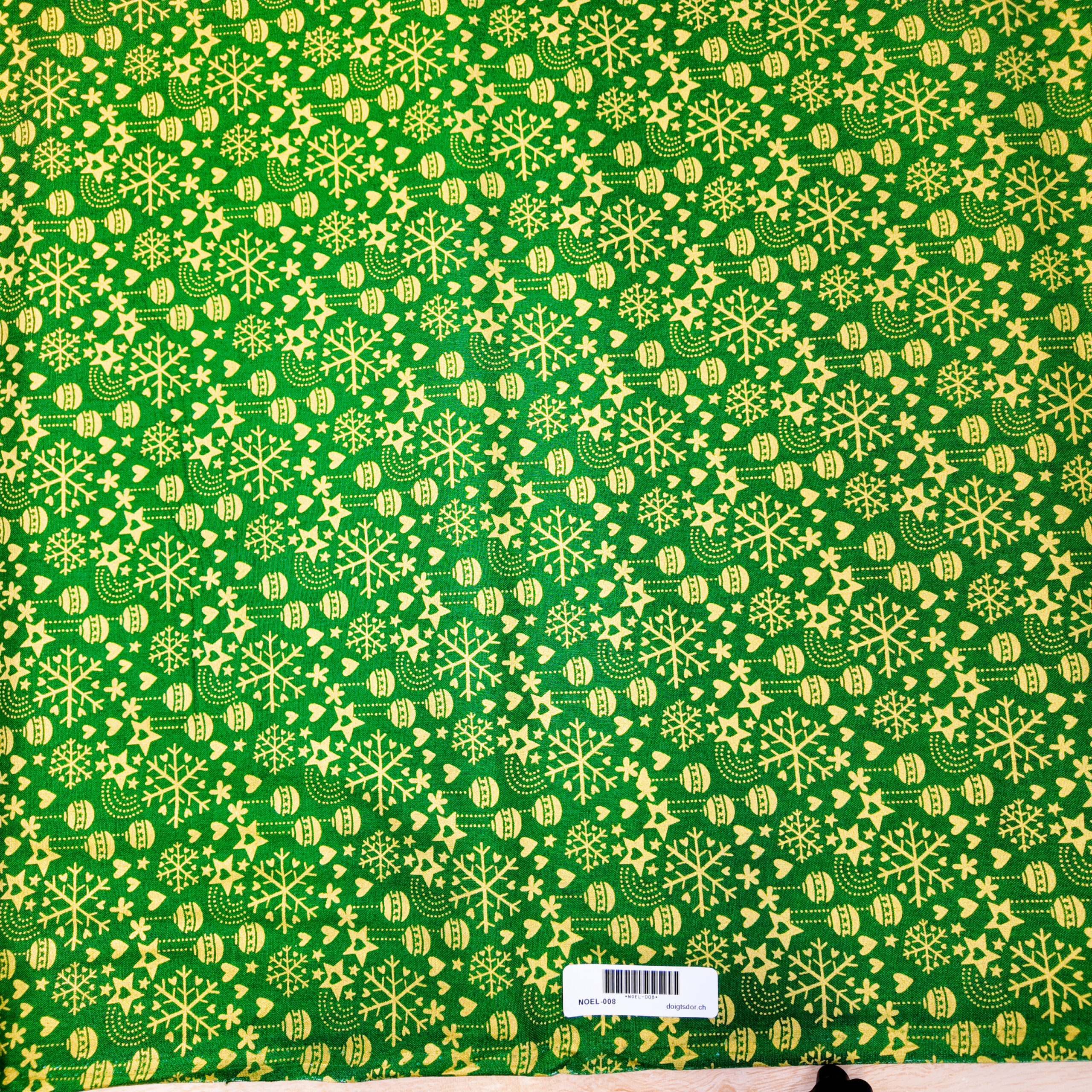 Fond vert tendre rythmé de motifs dorés représentant oiseaux, cloches et flocons. Un air de fête parcourt ce tissu, joyeux et plein de lumière.