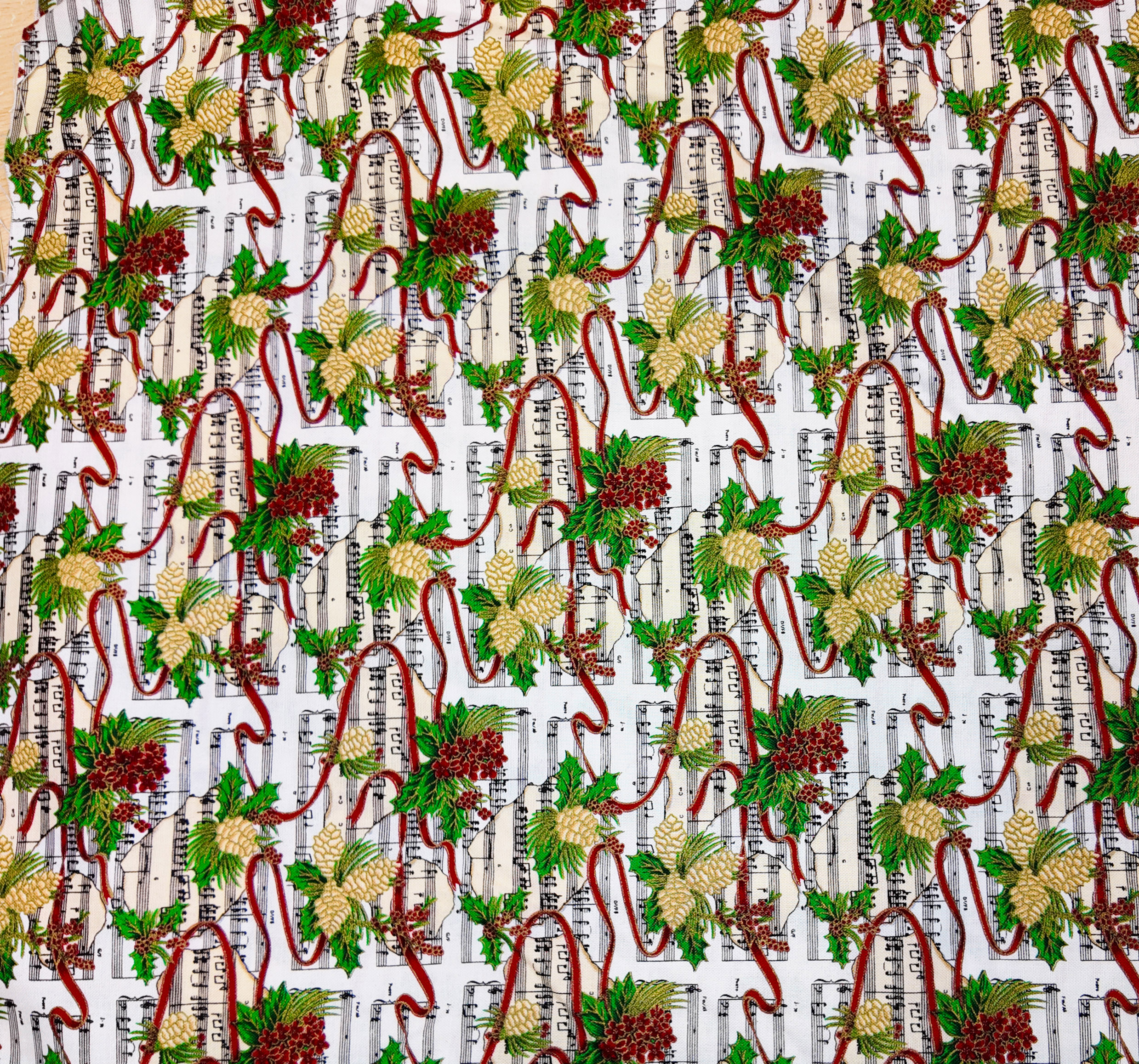 Feuilles de houx et pommes de pin enlacées de rubans rouges sur fond de partitions anciennes. Un mariage harmonieux entre nature et musique des fêtes.
