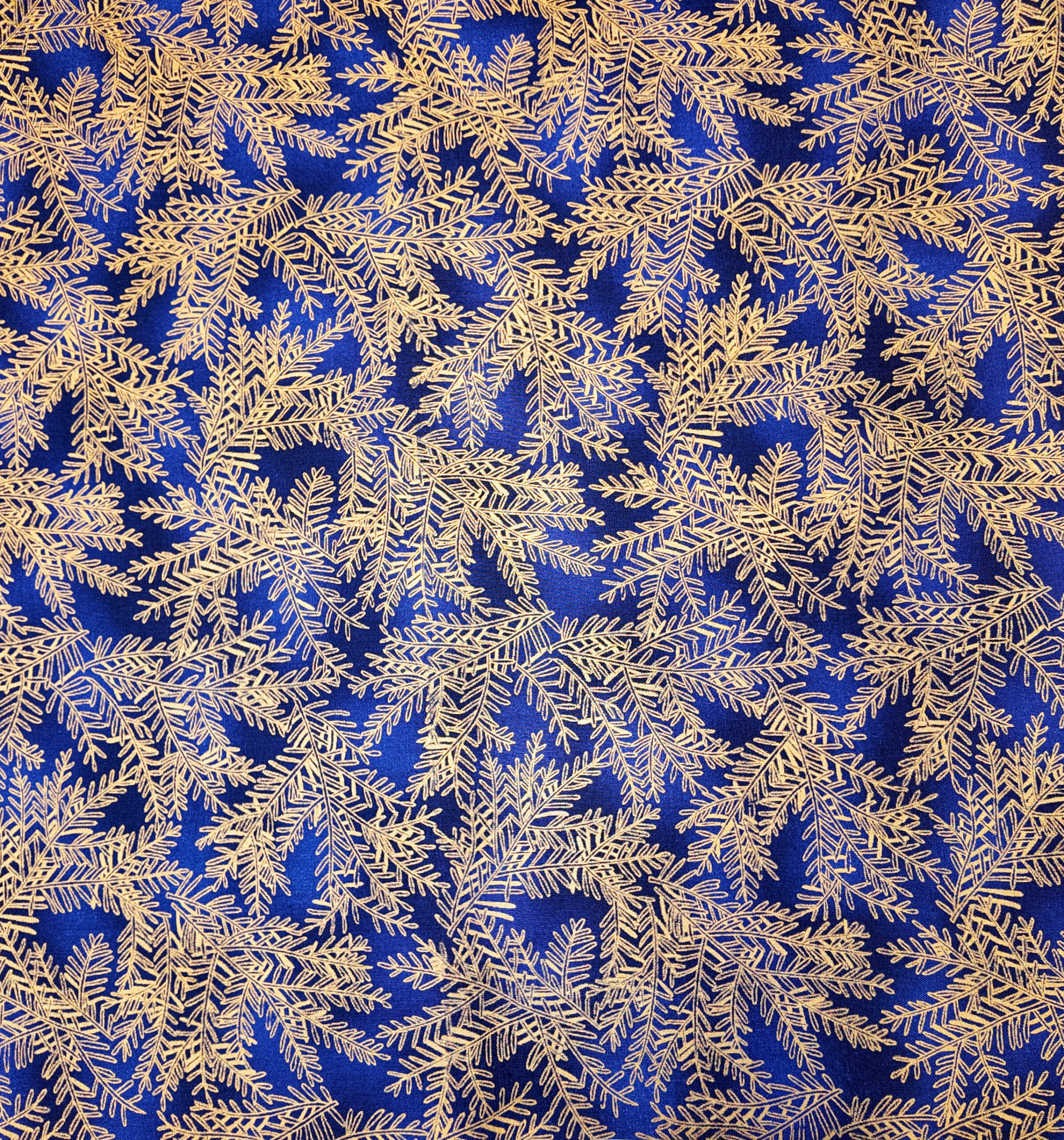 Un bleu profond recouvert de fines branches dorées évoque la forêt illuminée d’un soir de fête. Ce tissu respire la chaleur du sapin et la délicatesse des décorations naturelles.