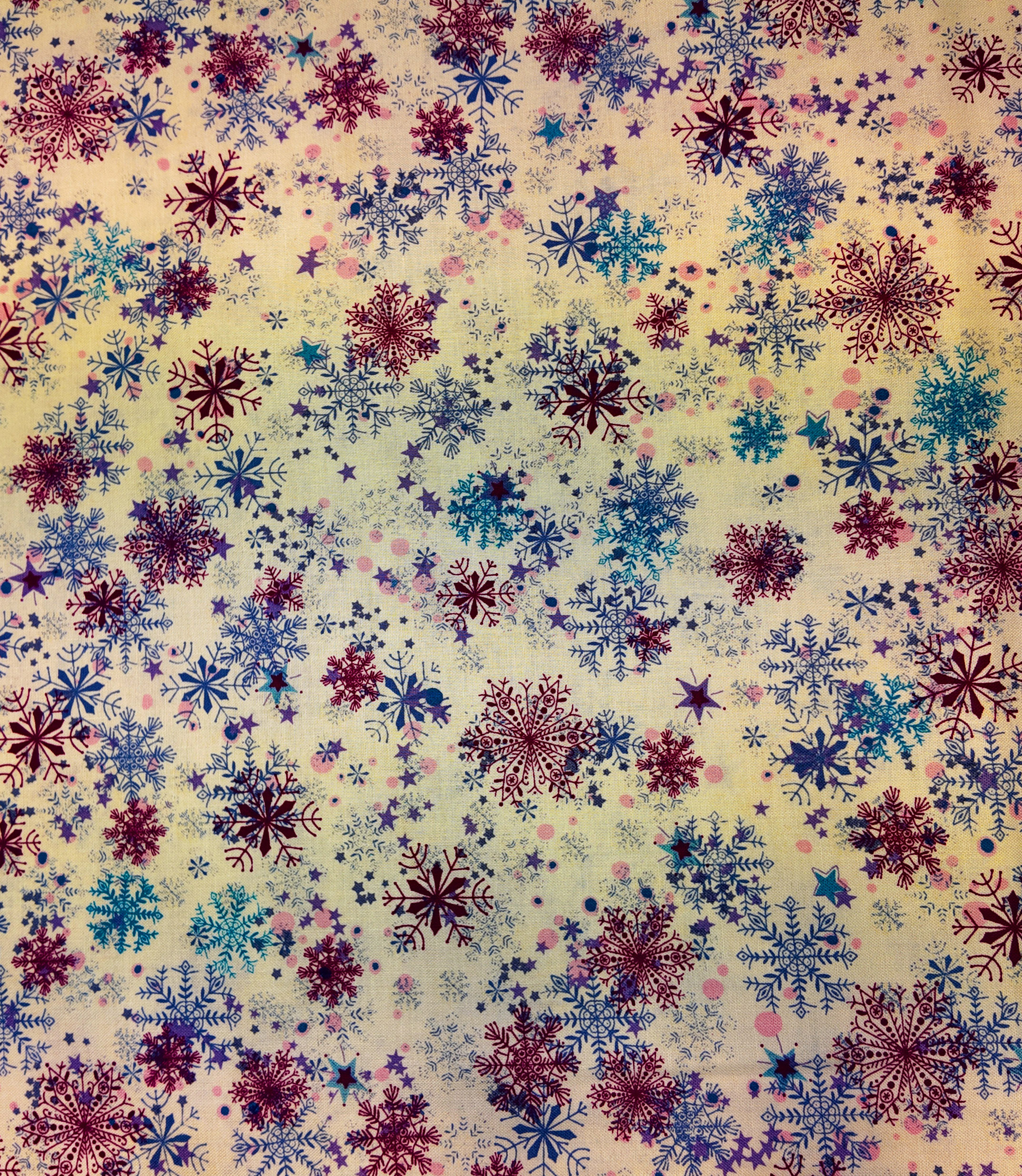 Des flocons éclatants en violet, bleu et rose se dispersent sur un fond doré pâle. Ce tissu illumine l’hiver d’une touche magique, entre rêve et féerie polaire.