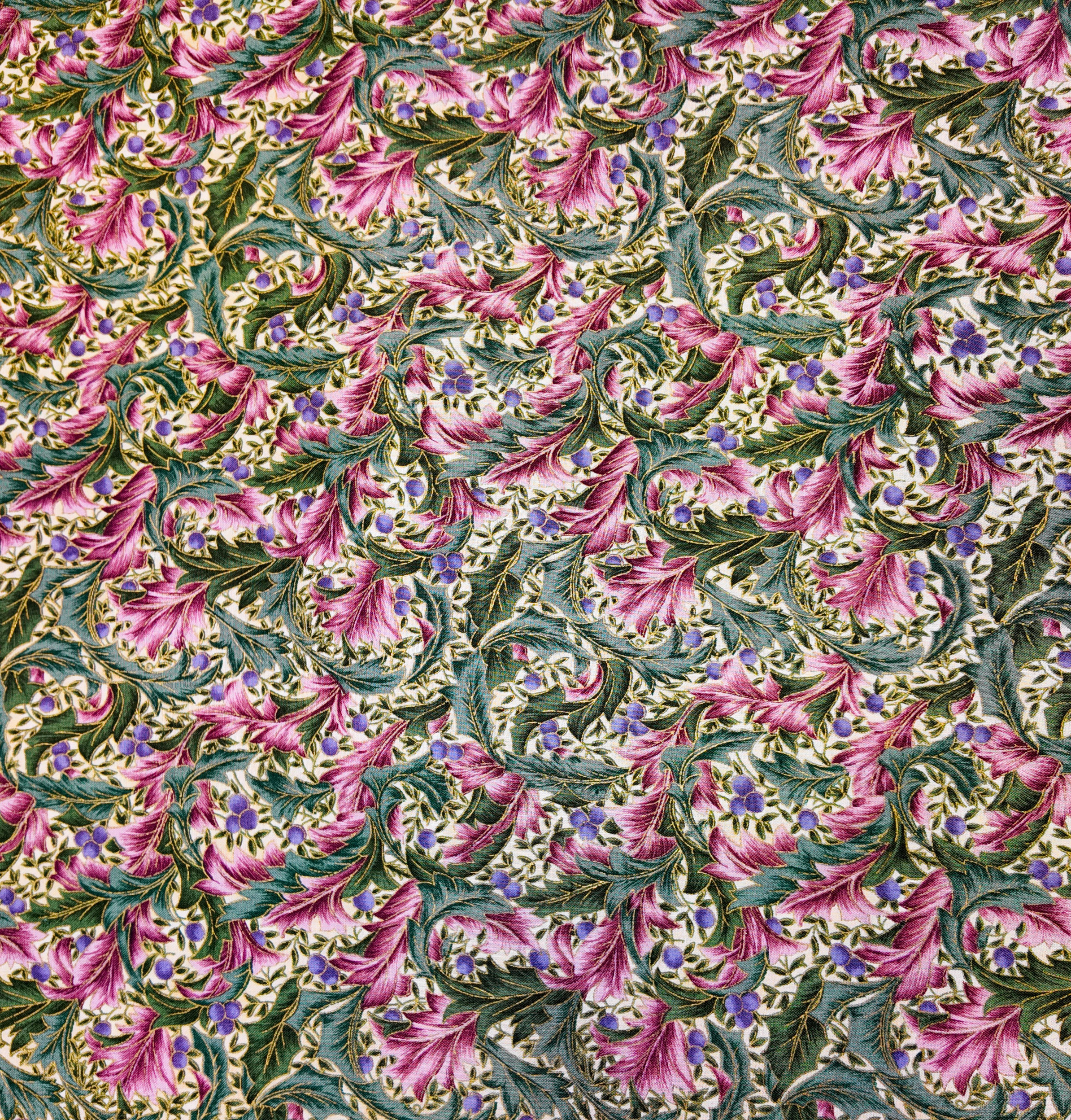 Un feuillage raffiné mêle vert profond, rose et violet dans un mouvement végétal et enchanteur. Ce tissu respire la nature stylisée, entre élégance florale et inspiration hivernale.