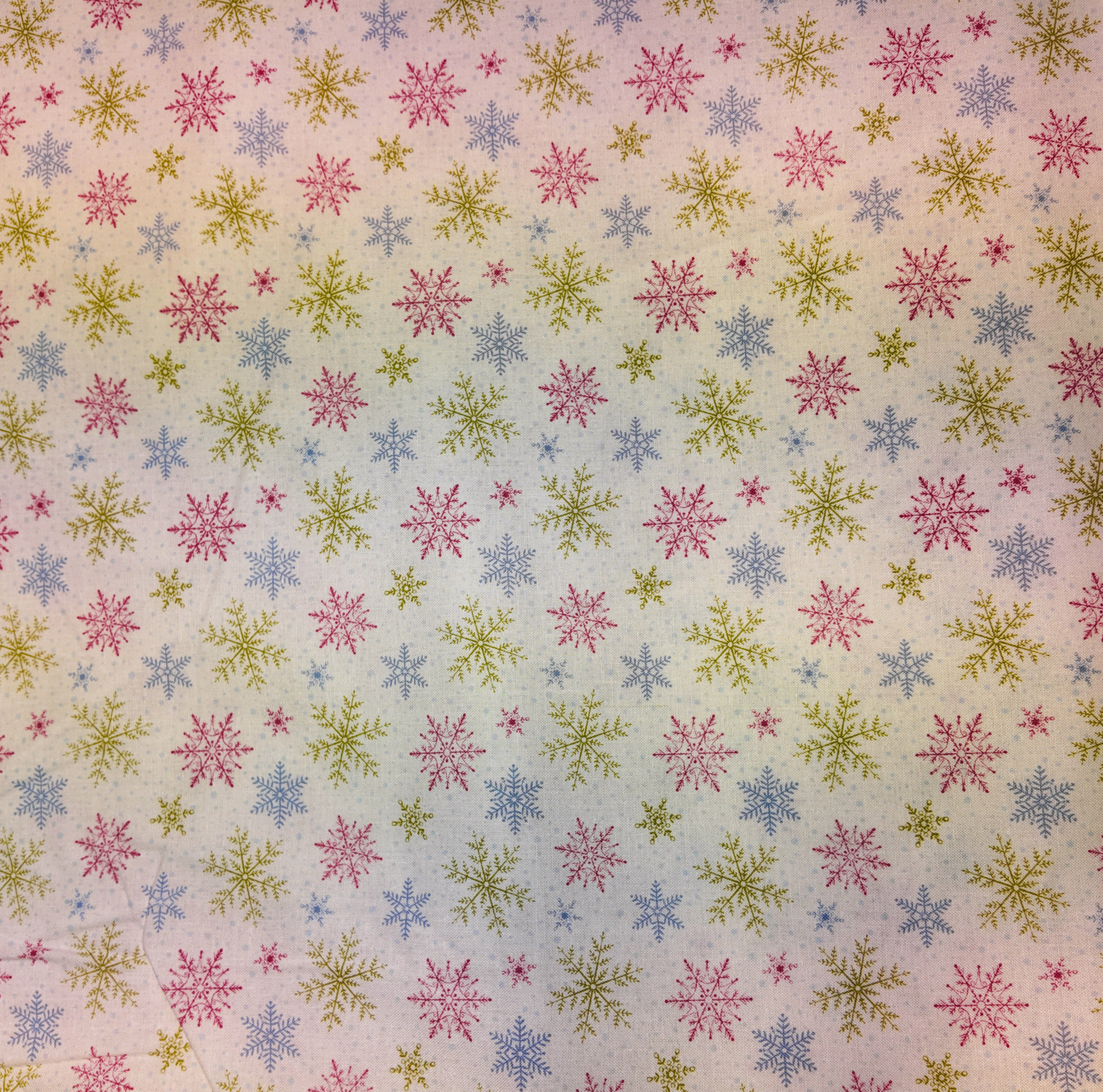 Sur un fond clair, des flocons roses, verts et bleus se répondent comme une pluie de cristal pastel. Le tissu diffuse une impression légère et joyeuse, empreinte de fraîcheur hivernale.