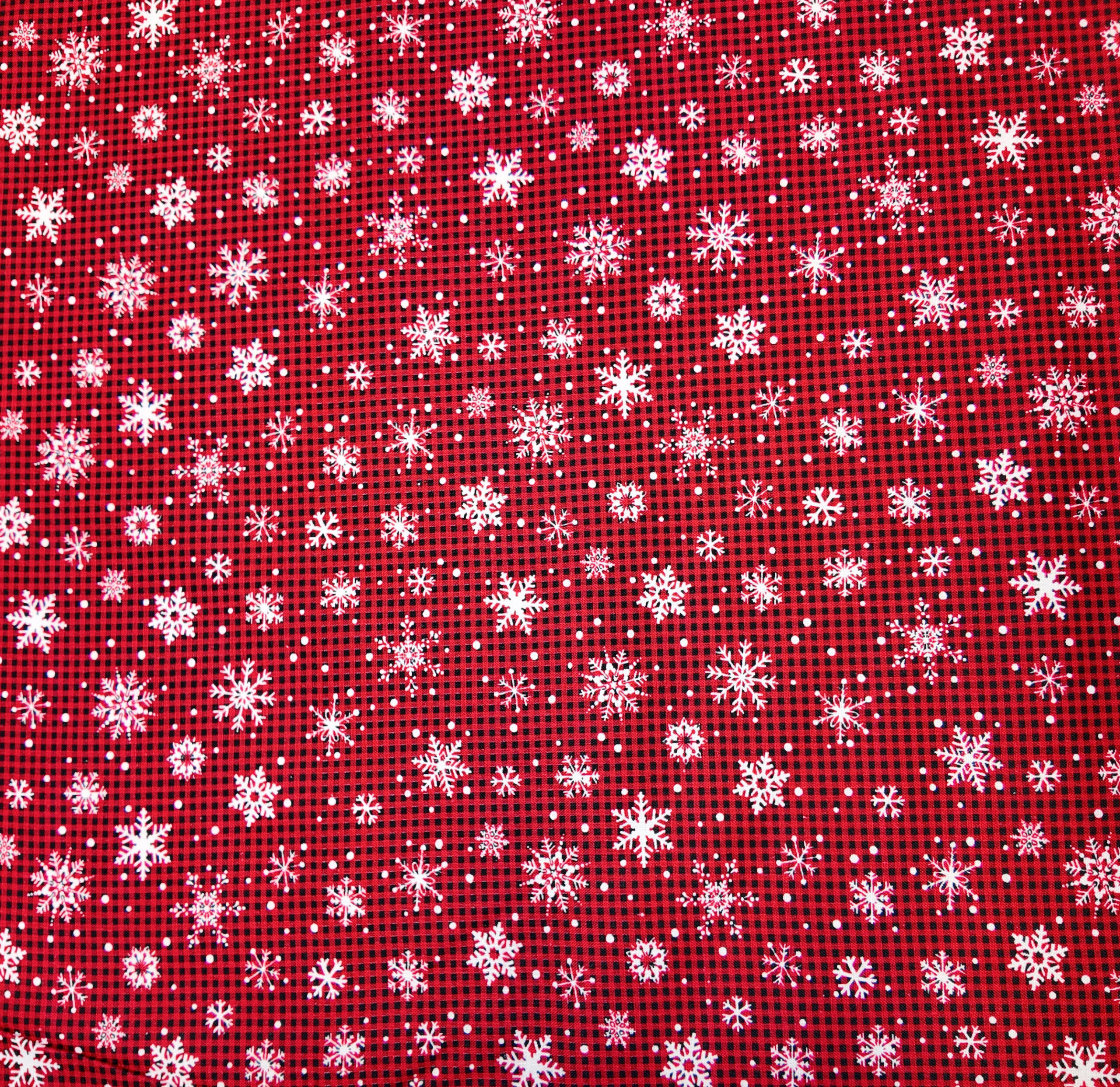 Sur un fond rouge quadrillé, des flocons blancs se posent avec légèreté comme une neige fine d’hiver. Ce tissu évoque la chaleur d’un chalet sous la neige.
