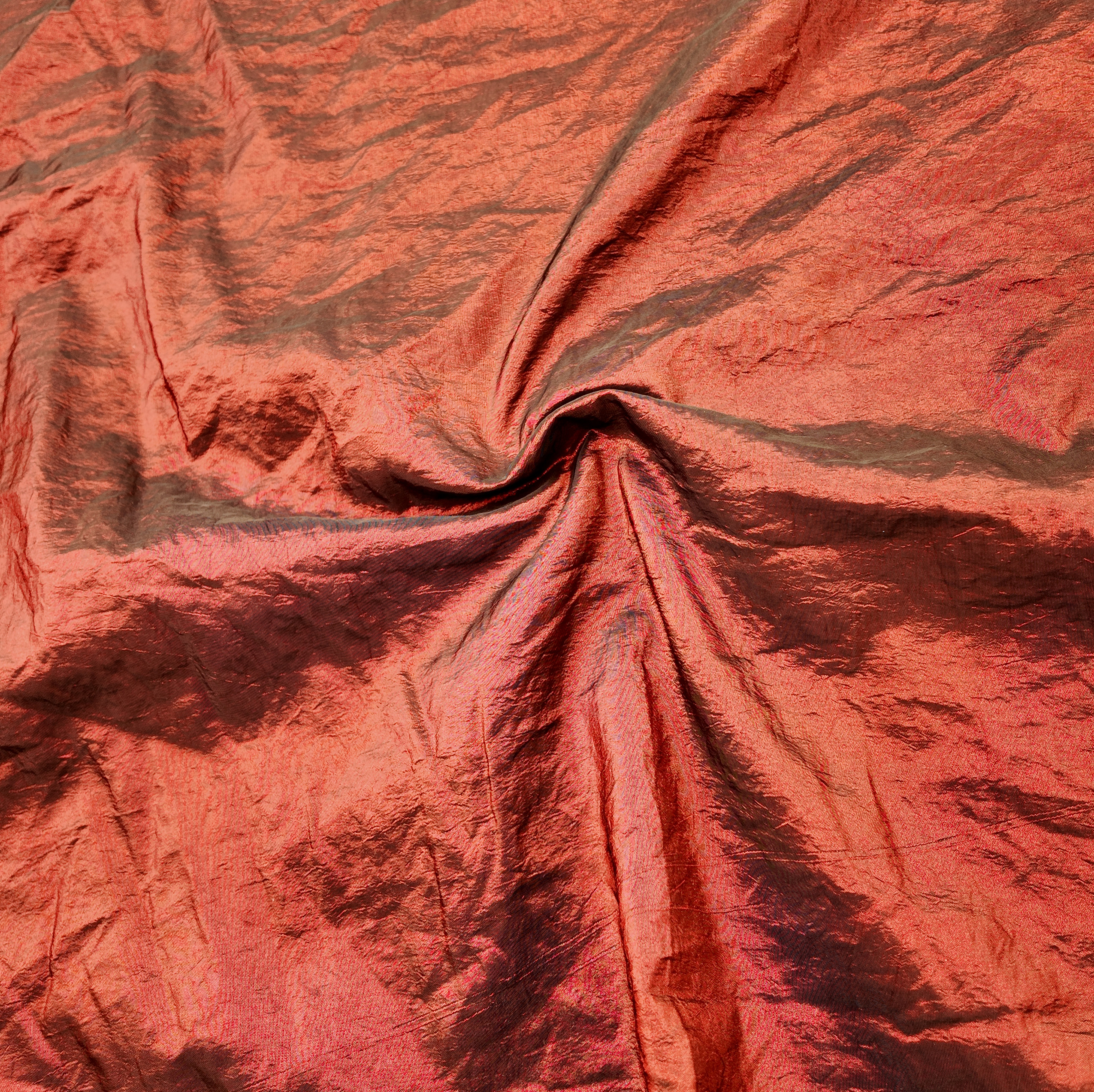 Une surface froissée aux reflets changeants mêle des nuances cuivrées, rouges profonds et ombres sombres, créant une matière vibrante où la lumière glisse et se transforme selon l’angle du regard, entre intensité métallique et chaleur enveloppante.