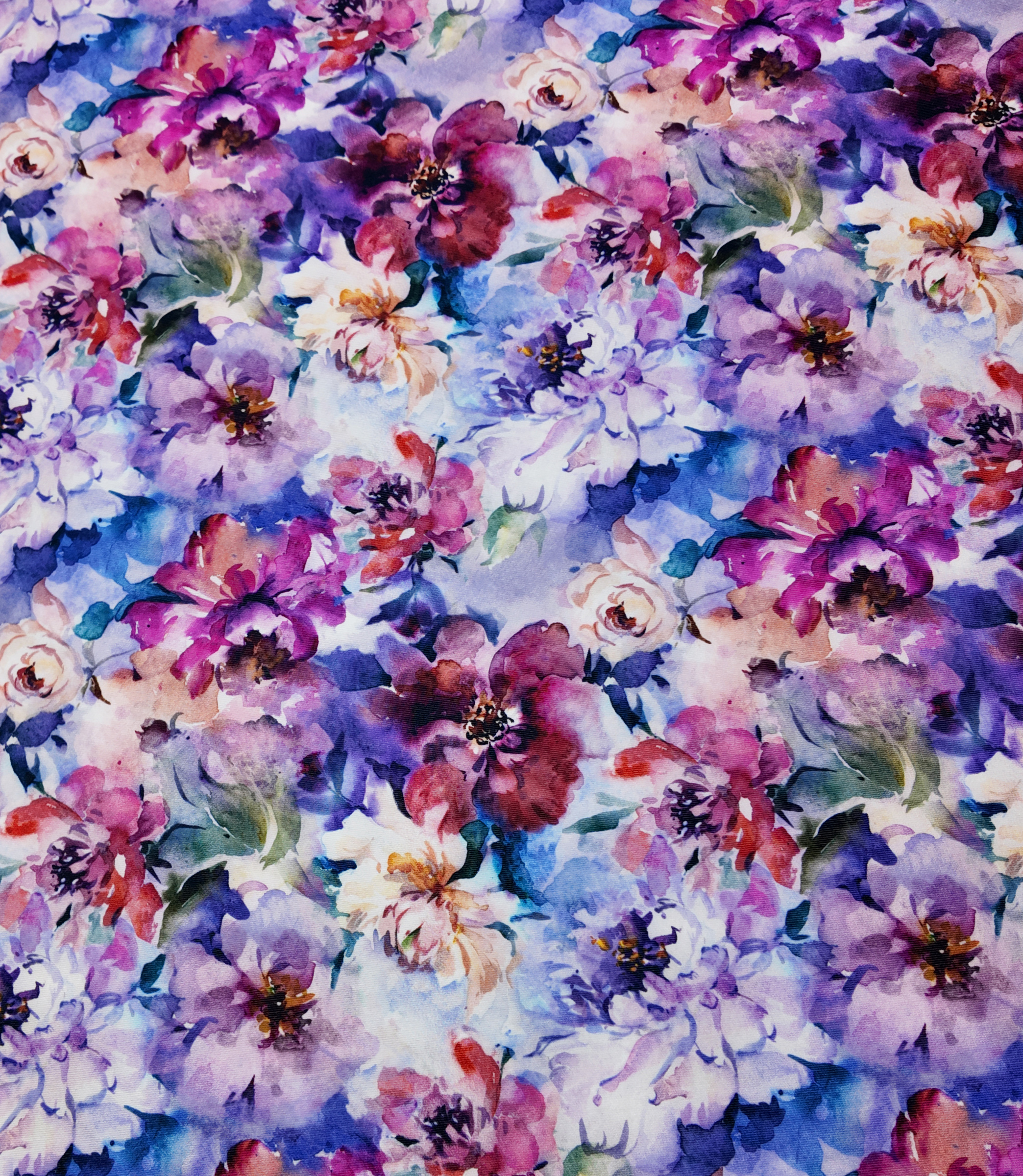 Un bouquet peint dans une explosion de teintes vives, où les fleurs se mêlent dans un foisonnement de pourpres, bleus et roses. L’ensemble évoque une aquarelle généreuse, lumineuse et pleine de mouvement.