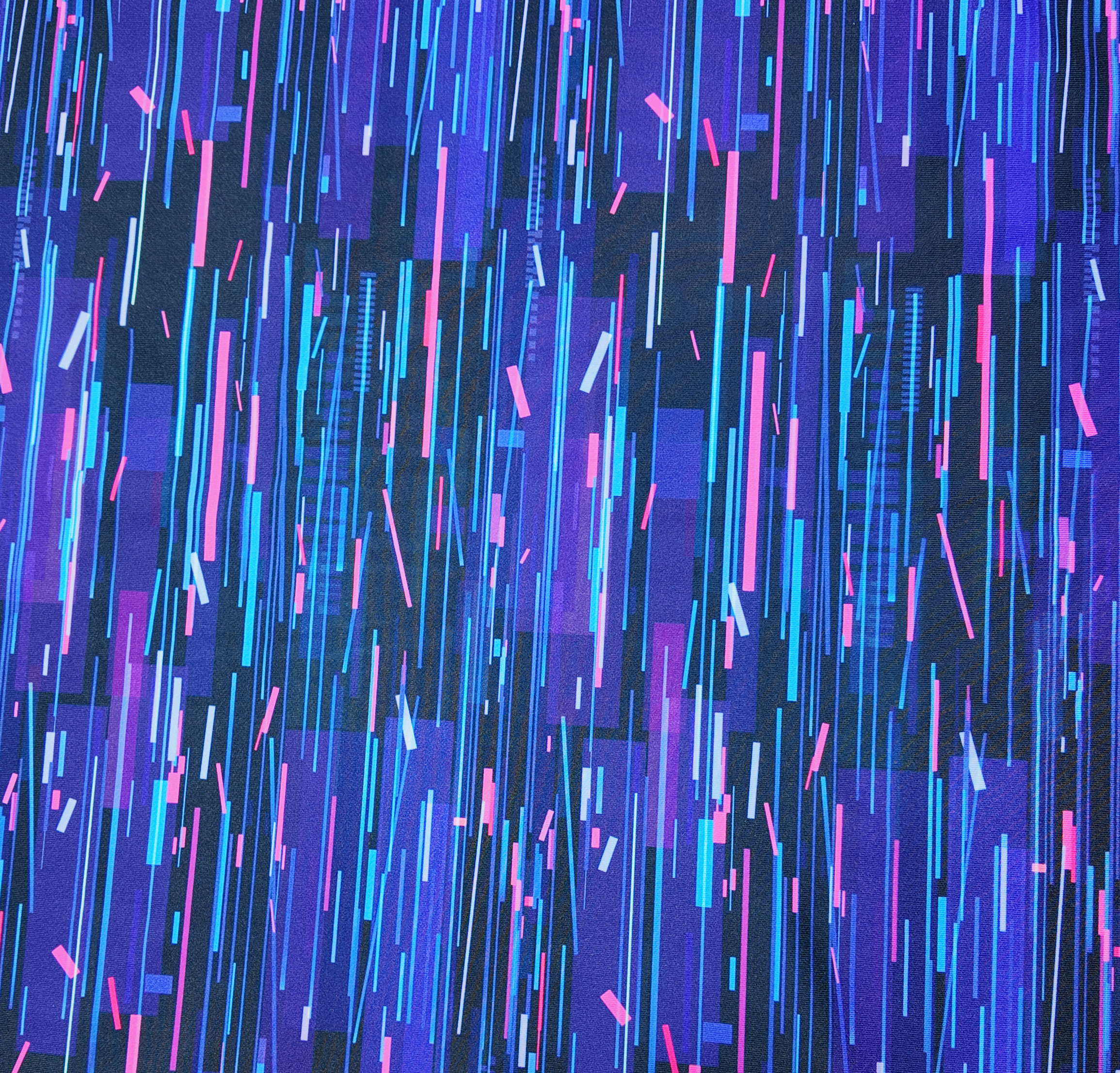un flot de bleu, turquoise et rose glisse en lignes vives sur un fond nocturne, comme une pluie lumineuse traversant un ciel profond.