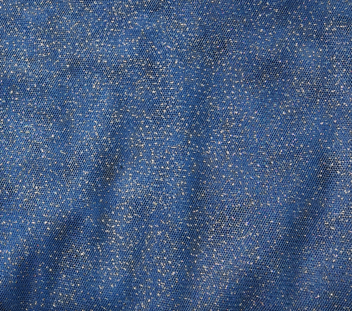 une maille bleu intense parsemée de micropaillettes lumineuses, rappelant un ciel étoilé en mouvement. Les reflets argentés dansent sur la surface et donnent au tissu une vibration dynamique et élégante. Une profondeur bleue aux accents scintillants.