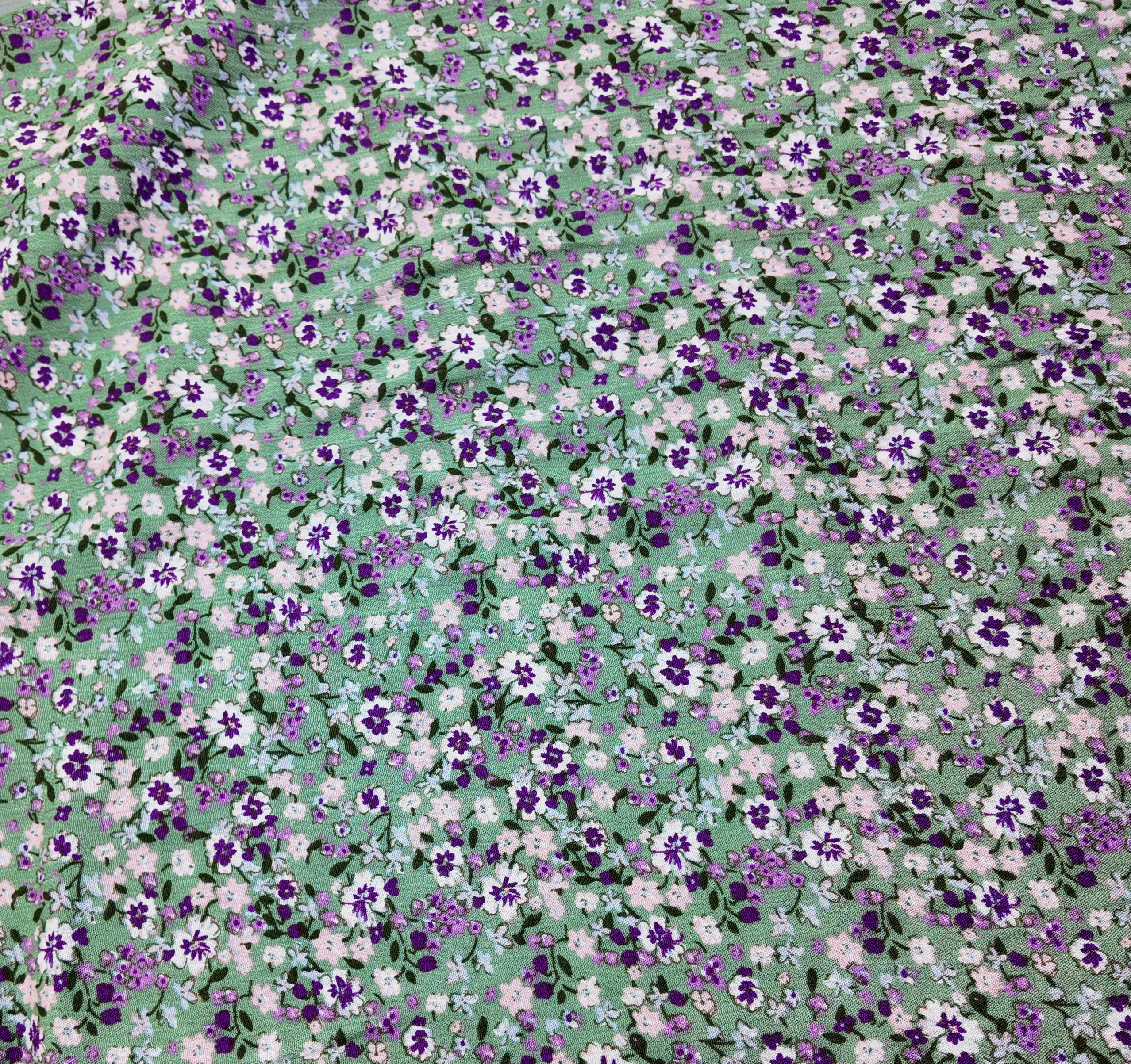 Tissu de viscose. un vert tendre où se mêlent des fleurs blanches, violettes et lavande, évoquant un souffle printanier apaisant