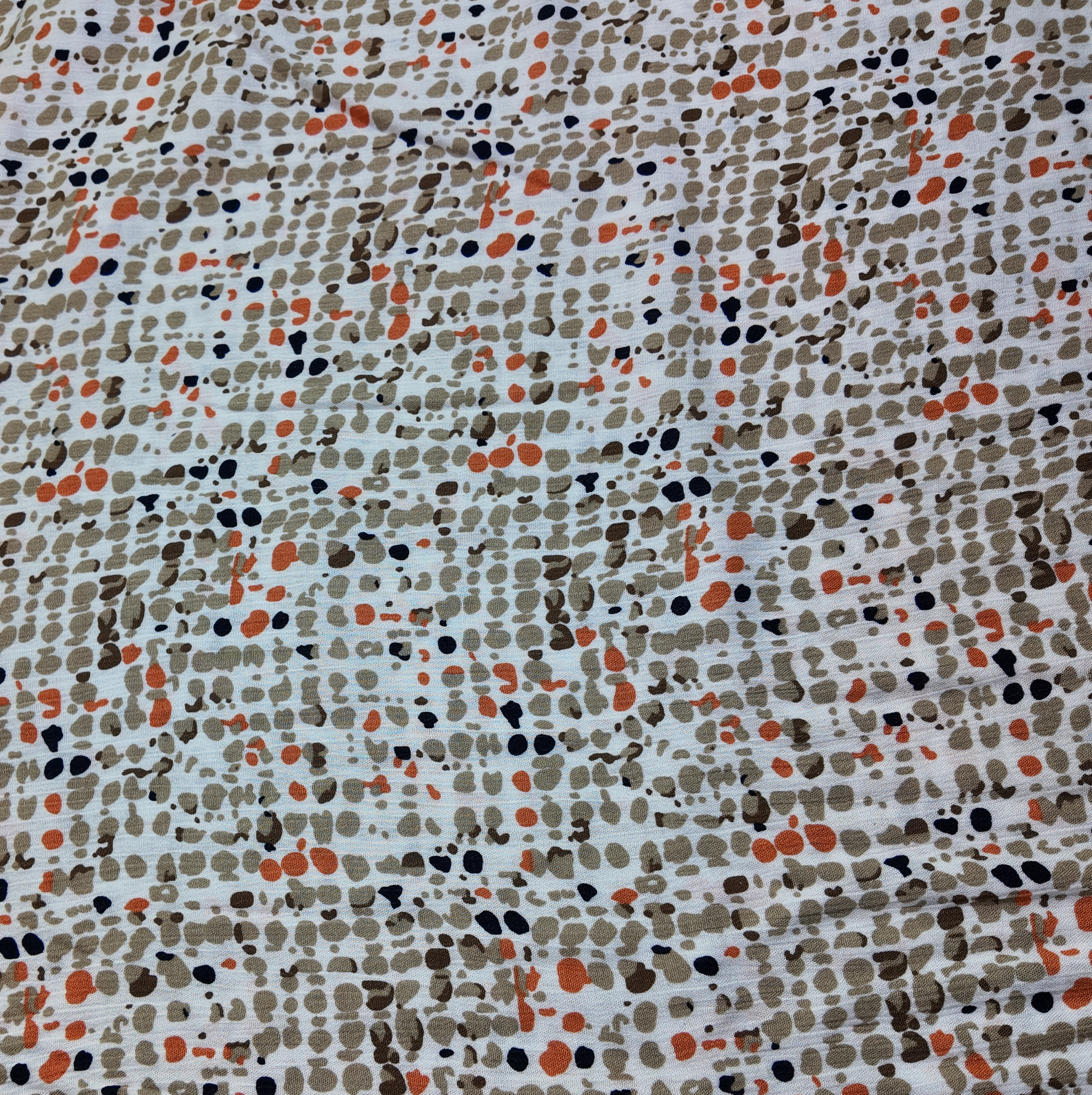 Tissu de viscose. touches orange, sable et noir déposées en mouvements légers sur une base claire, comme une danse de petites traces colorées