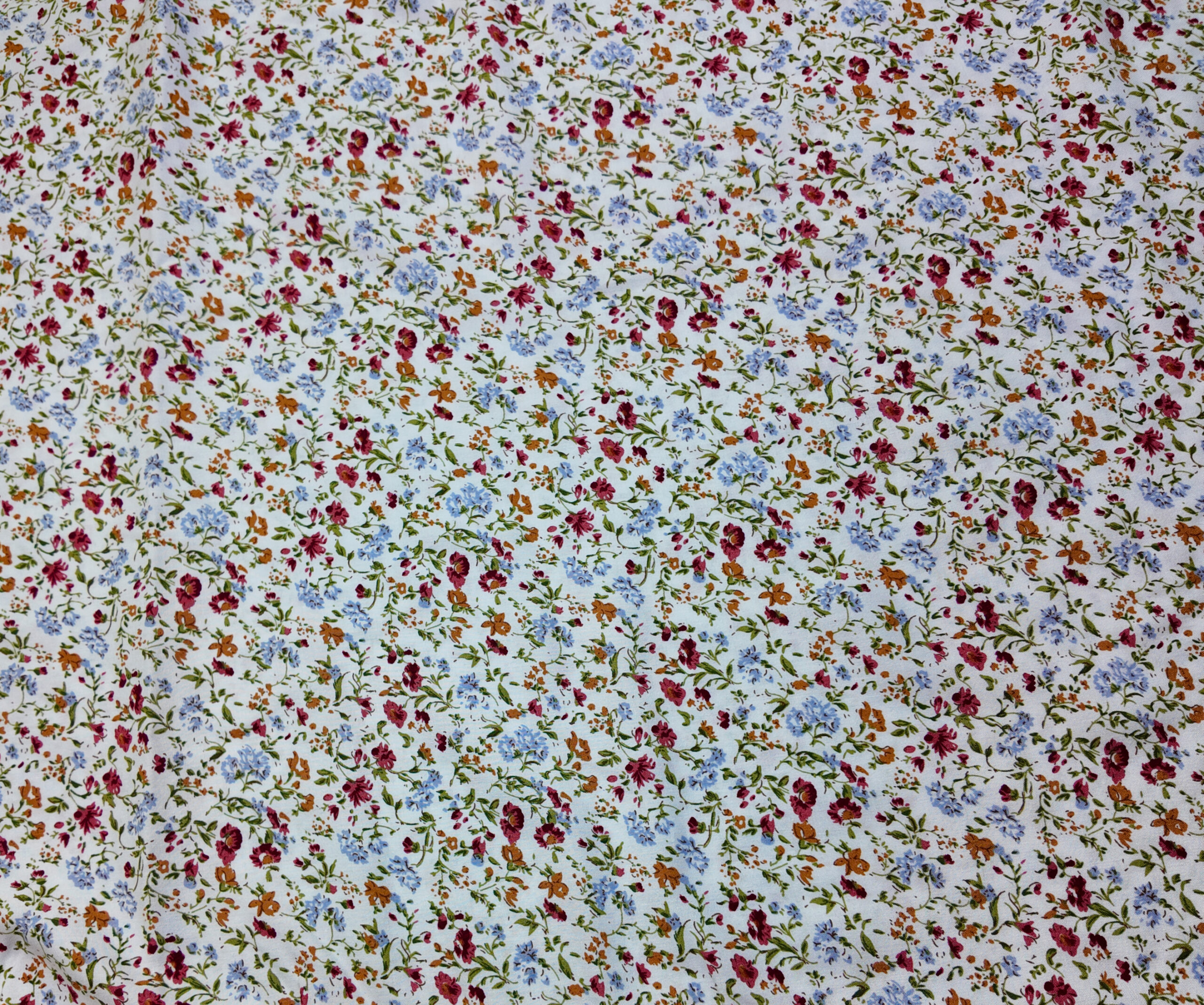 Tissu de viscose. un parterre de petites fleurs rouges, bleues et orangées posé sur un fond clair, comme une prairie vivante baignée de lumière