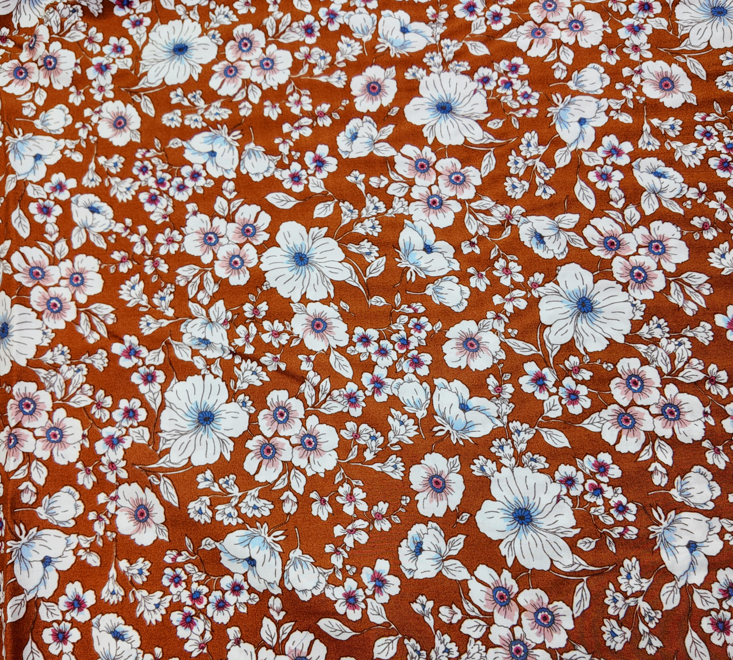 Tissu de viscose. fleurs blanches et bleutées illuminées par un fond brun chaud, rappelant un jardin lumineux sous un soleil d’automne